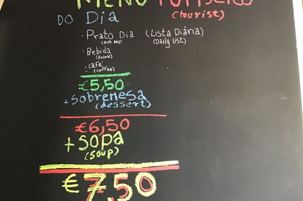 In many cases, yes. While you shouldn’t expect it in the large touristy centres and at dinner, many times at lunch, restaurants have what we call “Menu” or “Diária” (in the north). This normally is a fixed price menu with an appetizer, usually bread and olives, a couple of options for main dish, normally one fish and one meat, soup or dessert and coffee. These set menus can range from 6/7€ to 11/12€ (more common) or up to 14/15€ in some places in Lisbon, depending on the place and the dish itself, but it’s a more economical way of doing your meals instead of “a la carte”, where you may get more but you end up paying a few euros more per person. So it basically depends on what you want and what you eat. Be sure to ask if you can’t see that written up at the entrance.